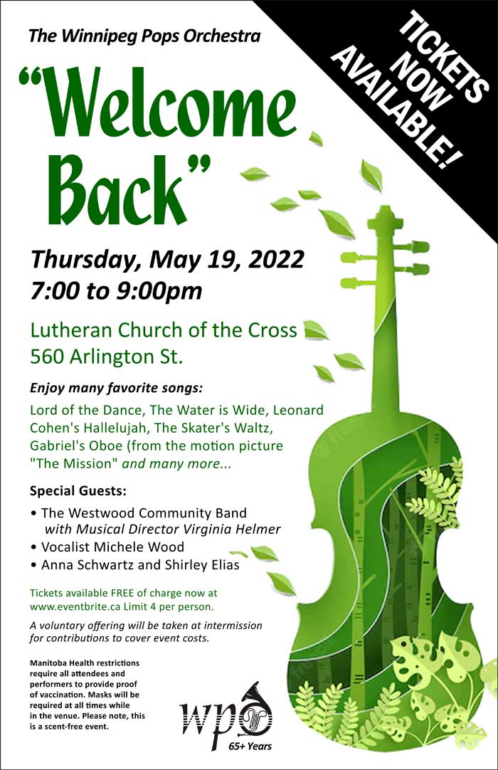 Conductor Owen Clark and The Winnipeg Pops Orchestra proudly welcome you to our "Welcome Back" concert for Spring 2022. Come and enjoy favorites like Lord of the Dance, The Water is Wide, Leonard Cohen's Hallelujah, The Skater's Waltz, Gabriel's Oboe (from the motion picture "The Mission", plus songs and arrangements by Johann Strauss, Astor Piazzolla, Winnipeg's own Anna Schwartz, Owen Clark, Phil Winkless, and many more.